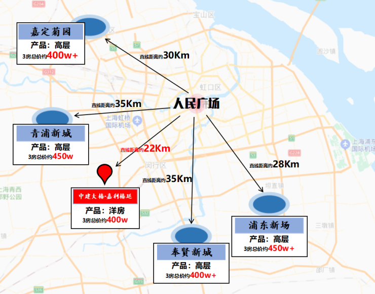 例如:嘉定菊园、青浦新城、奉贤新城、浦东新场......这些板块距离市中心基本都在约30公里左右甚至将近约35公里。