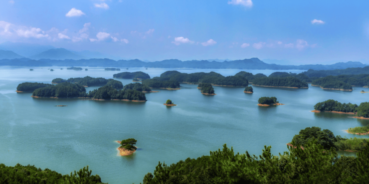 群山绵延,森林繁茂,湖水晶莹透澈,为国家一级水体,被誉为"天下第一秀水",曾以1078个岛屿入选世界纪录协会世界上最多岛屿的湖。