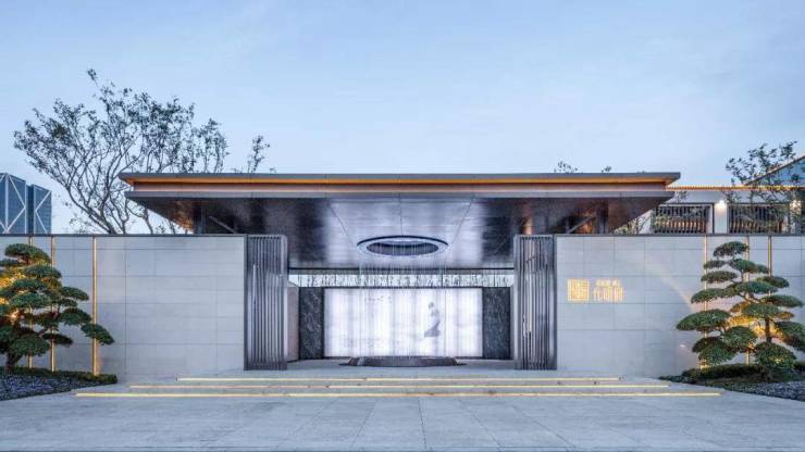简洁、舒朗、怡然自得的生活情趣意味在后场空间的组织里展现得淋漓尽致,将地域、古典文化融入住区中,打造一处富有地域特色的景观。售楼处后场对景墙采用“比翼鸟”羽毛的元素,在空间进出有限的条件下,设计师运用简单的线性元素勾勒出一面立体照壁,羽毛、光影、灯光的组织,一实一虚,使得整个空间洋溢出大气、雅致的气息。