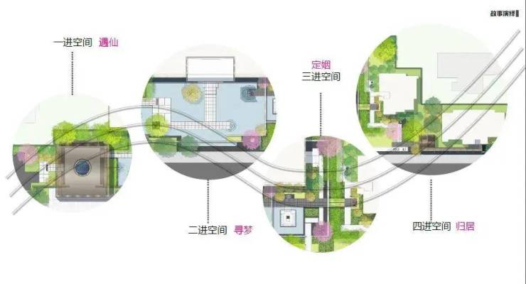 在示范区参观过程中,借鉴古典院落格局,整体空间采用“四进格局、四重体验”的手法,使参观者体验庄重的仪式感和归属感。同时,设计师在形、境、韵三个层次进行感官的叠加,严格推敲空间比例,划分出“遇仙”、“寻梦”、“结姻”、“归居”四重情景空间。