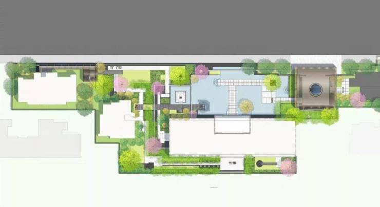 沿着入口来到中心水景花园空间。设计师借鉴“桥式”景观步道,打造滨水小径;镜面水中星光点点,夜间漫步于此,犹如漫步星空;于水景中植一株迎客松,树下水面晕开涟漪,尽显“简臻”韵味;“比翼鸟戒指”雕塑立于水面,水中喷雾蔓延,沿着其平静宽阔的水平面眺望, 让人拥有一种置身仙境中的错觉。