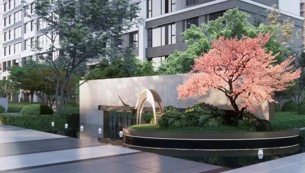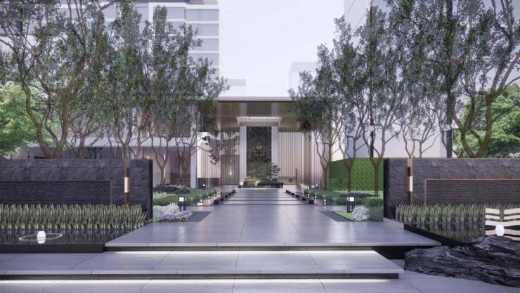 从街角公园,穿过线性的外场景观来到南侧天幕流光的人行入口;前期作为展示区的形象大门,后期大区永久保留不做拆改,也是作为小区后期主要人行归家入口。踏桥归家,端头利用迎客松与水幕景墙结合,为归家带来了仪式感与生活质感。