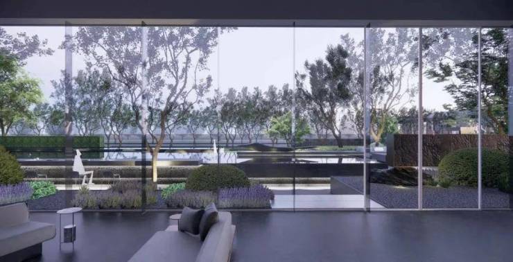 地块南侧前期为展示区,后期作为无界公园。一片镜水,水中的倒影、光线穿过树丛投射下来的光影,仿佛一幅高品质的生活画卷;穿行其中,辗转叠合,是移动的风景,亦是艺术在无界里肆意渗透;自然、多维感知、万物无界共生的场景,创造人、自然与建筑的无界共生。