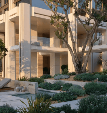 地中海度假风 + 精工立面:白金色铝板 + 茶金色 Low-E 玻璃,保加利亚进口莱姆石基座,蓝调水景 + 西班牙油橄榄园林,氛围感拉满。