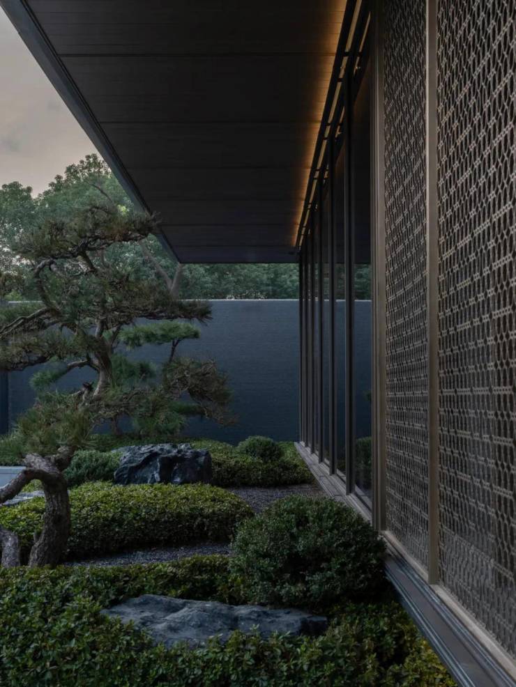 行馆式归家体验彰显东方礼序的底蕴与尊贵感。入口结合空间尺度,选用黑山石作为点景置石,与主景造型黑松、镂空福鼎黑垒石景墙组合成景,营造至简至静的门庭气质。景墙围合式入口与典雅大堂共同打造归家仪式礼序感,享“出则繁华,入则静谧”。