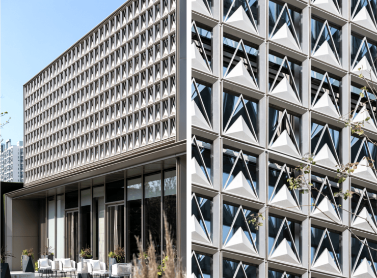 外立面主材料通过轻盈现代的金属铝板和高反射玻璃搭配,将一个方正的几何“精致盒子”营造出属于现代建筑的简洁观感,体现建筑立面的仪式感和可识别性。