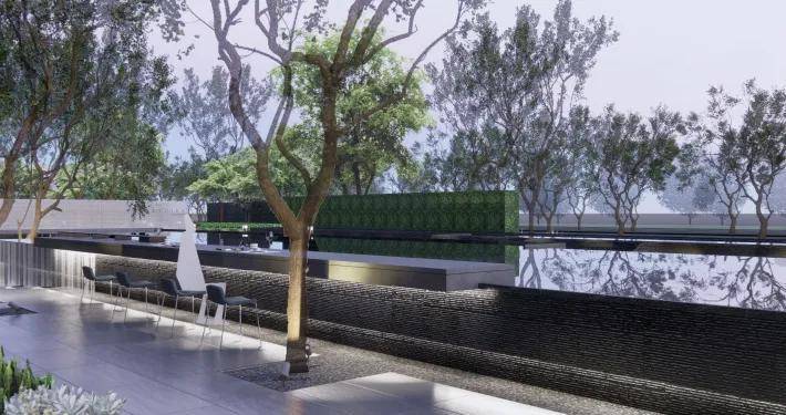 地块南侧前期为展示区,后期作为无界公园。一片镜水,水中的倒影、光线穿过树丛投射下来的光影,仿佛一幅高品质的生活画卷;穿行其中,辗转叠合,是移动的风景,亦是艺术在无界里肆意渗透;自然、多维感知、万物无界共生的场景,创造人、自然与建筑的无界共生。