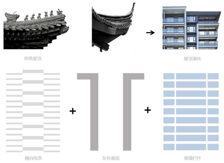立面色调典雅、简素,灰白相间的色彩与江南传统民居的意蕴相契合,屋顶采用舒展的深灰色飘板进行修饰,隐喻中国传统建筑的屋顶形态。