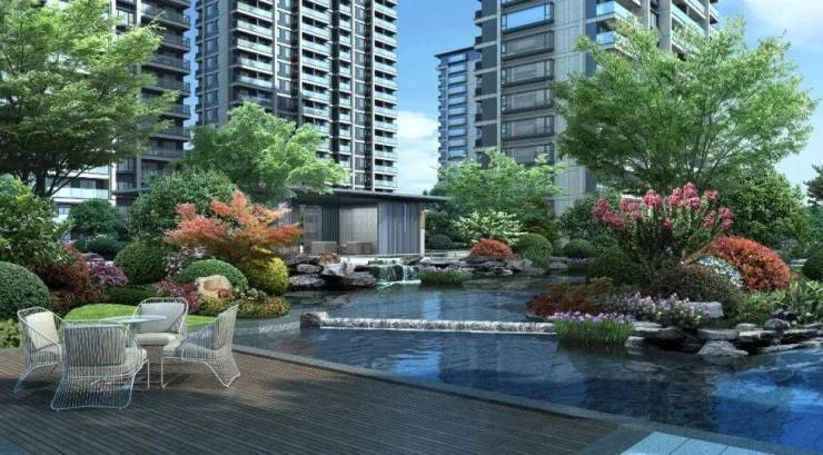水是中式园林的灵魂,我们在东西两个地块的入口轴线上分别设置了两片水面,采用相对自由的岸线布置,假山穿插其中。