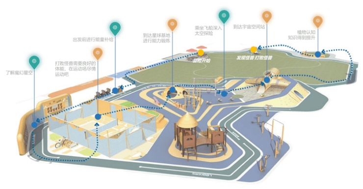 东区设置星空主题乐园,配置MINI运动场、滑梯、攀爬坡、秋千等,采用塑胶材质地面有效减少儿童运动损伤,配置婴儿车位、储物柜、座椅等,打造无龄感主体探索活动空间。