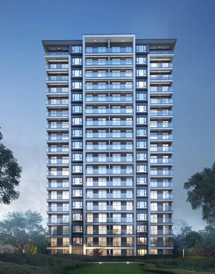 住宅立面设计采用现代和传统相结合的设计手法,整体形态简洁、大气,通透的大面积玻璃横向展开,浅色质感横向、纵向线条作为立面的主要构成元素,勾勒出建筑的骨架,基底则采用高级灰色。
