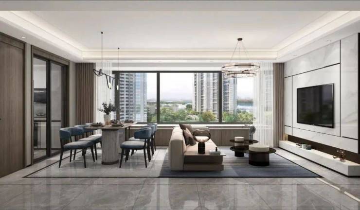▲约129㎡样板间全景纵厅软装效果示意