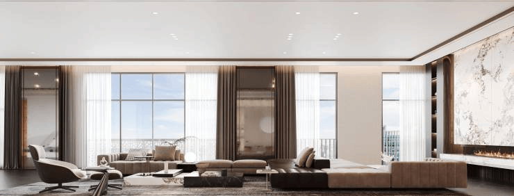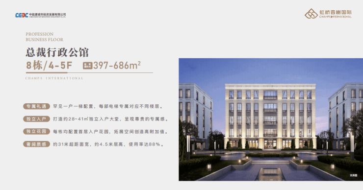 法式平墅:单层面积397-686m²,均价2.5w元/m²,通燃气,入户有独立花园,共5层,一户一梯