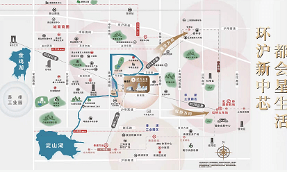 千灯作为一线环沪版块,以项目为中心, 向北是昆山市区; 向西是苏州园区; 向南是上海青浦(青浦 作为上海五大新城重点发展区域之一), 向东是上海未来新中心--大虹桥区域;目前上海向西发展已成大势,未来十年虹桥商务区将更进一步发展, 沪苏同城化不断推进,千灯发展受到带动影响会更完善。