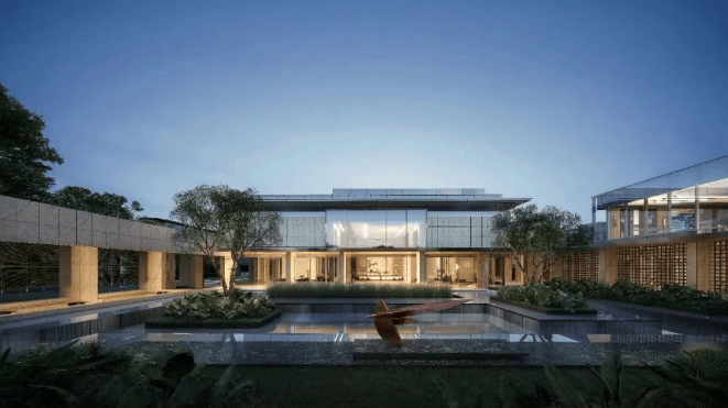 无界会所:约 628㎡的无界会所,内部配置中央空调和壁炉,Prada 绿奢石材料配合镜面水景和度假风绿植,营造出酒店式度假氛围,为业主提供商务会晤、运动切磋、邻里交流等空间。