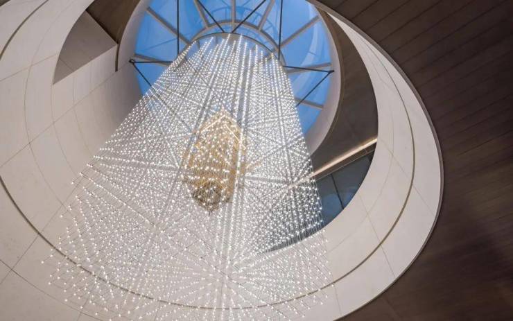 主体建筑北侧正面的入口处,结合艺术楼梯及艺术装置,形成点睛之笔,结合艺术楼梯本身的展示性,结合天窗光影变化,赋予空间以感悟,强化昭示效果;这也是行走动线上的重要节点,艺术装置和天光的引入,增加了游览路径上感官的丰富性。