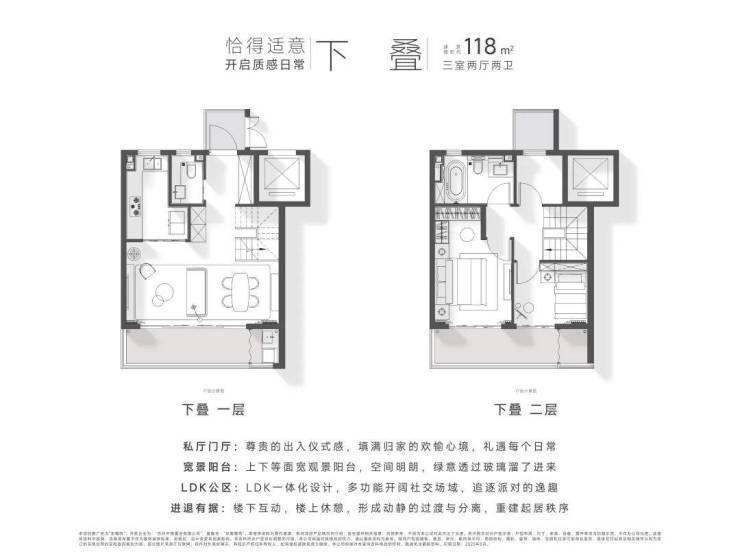产品户型建面约118-173㎡,下叠及中叠均自带院子,上叠配有阁楼露台,全南向,并且做到了独门、独院、独梯,极尽尊贵。