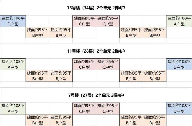 三栋楼都是2个单元,2梯4户的设计,由建面95平和108平2个面积段的4个户型组成,全部是三房两厅两卫产品。