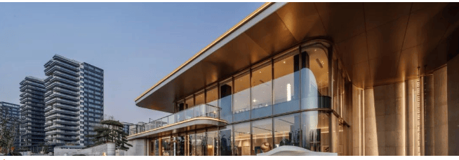 玉境流体:白金色彩相间的外挑铝板,有着外遮阳功能,犹如在湖光的映射下的灵动飘带,更添建筑细节的精致感。
