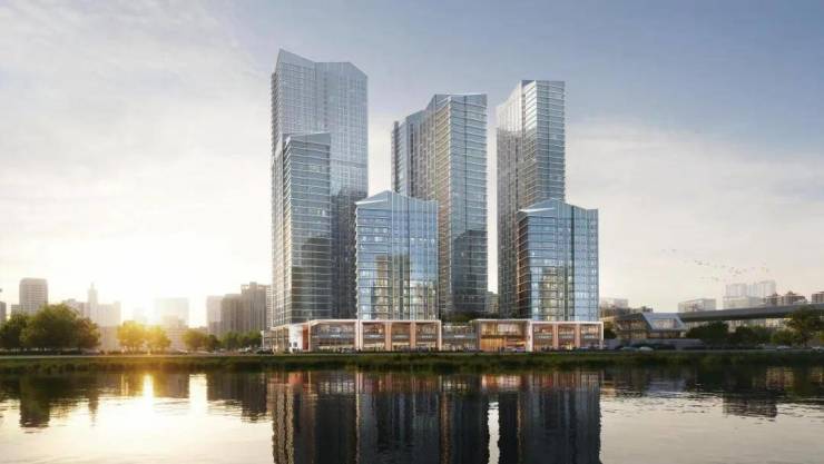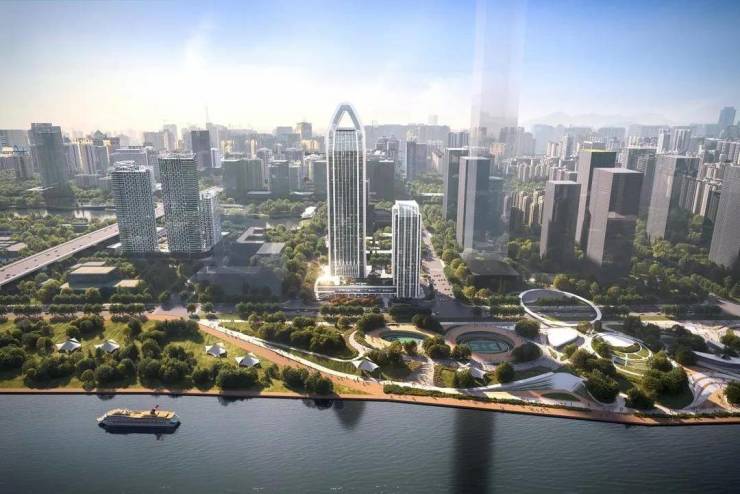 【现代立面,山水意境】现代化公建立面设计融入山水意境,玻璃幕墙与渐变铝板在光线下呈现“波光潋滟”的江面意象,呈现江山湖园共生共融的美好之境。