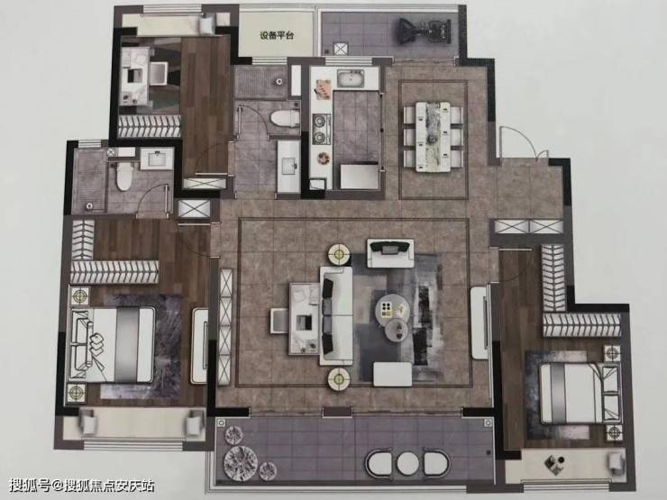 116㎡的户型为三房两厅两卫,阳光三房,动静分区,主卧次卧南北飘窗,阳光入室,俯仰清风,套房主卧,提高舒适度、私密性。