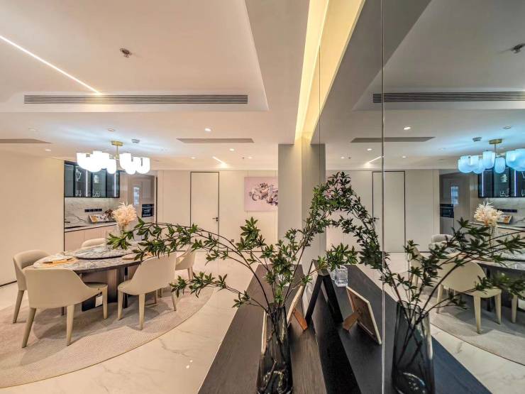 户型设计:主打约 174-282㎡奢贵轻法式限定大平层,得房率 83.7%。房型方正,五开间全明,通风采光好。户户带阳台,部分户型有 3 个阳台,实现休闲、晾晒、设备放置三分离,还有 U 字形明厨,独立上下水,全栋居住通燃气。