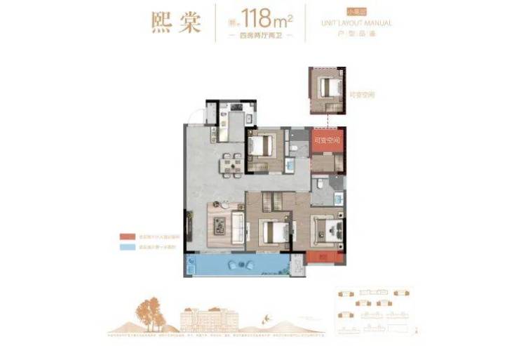 小高层建面约118m²:餐客厅面积明显增大,主卧带有独立衣帽间,整体尺度上更加舒适。