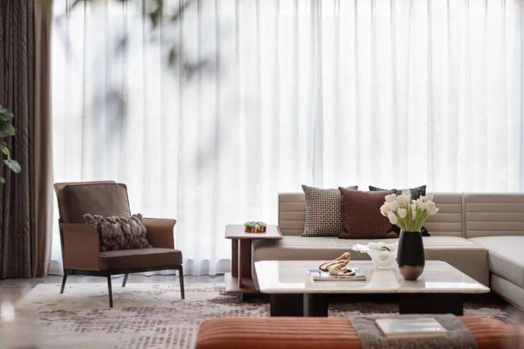 客厅在阔绰空间布局的背景基调上,软装设计将阳光、景观等自然元素无痕地穿插在生活区内,与精心打造的奢华室内装饰融为一体,给人带来温暖的触感,更营造了平和、宁静氛围。