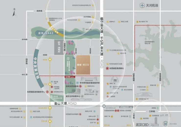临空港经济开发区是武汉第三个国际级经济开发区,近几年产业、配套发展都非常快,开发区内部也有功能划分,包括文体休闲、商业商务、科研总部、活力居住、以及国家网安基地等。项目位于板块北部活力居住区,临近迪马智能科技产业园和长江数字媒体城等产业。