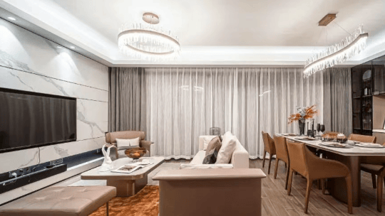 精装配置:配备老板抽油烟机、科勒大单槽台盆、方太一体式洗碗机、末端净水系统、欧神诺地砖、顶固品牌橱柜、唯宝马桶和台盆、高仪花洒和龙头、索菲亚定制浴室柜及镜柜等。