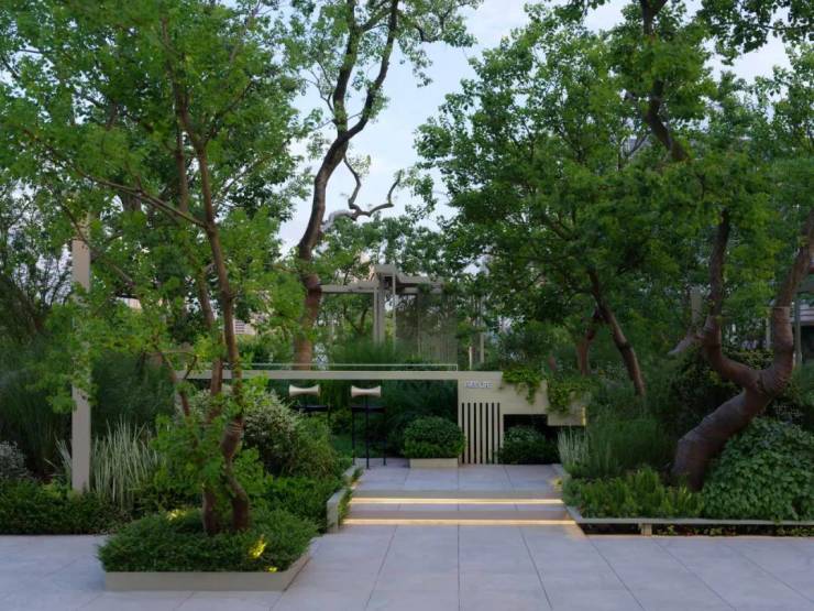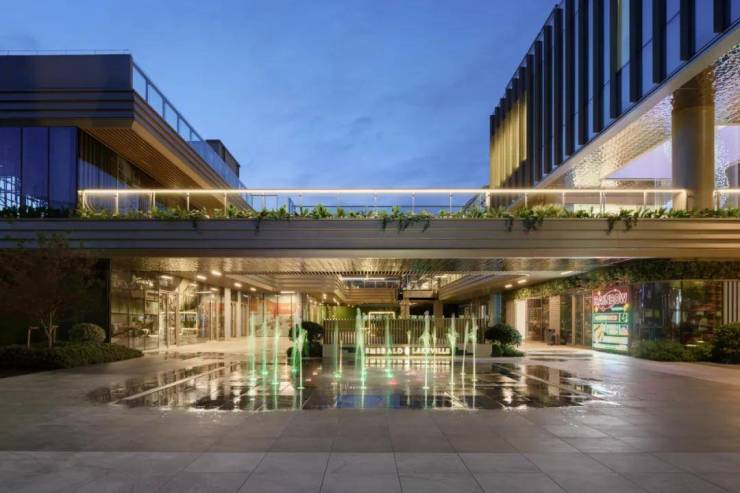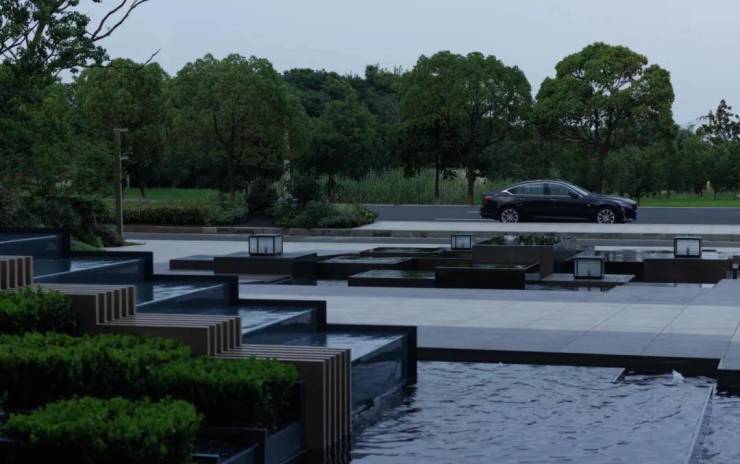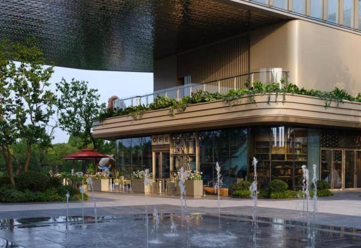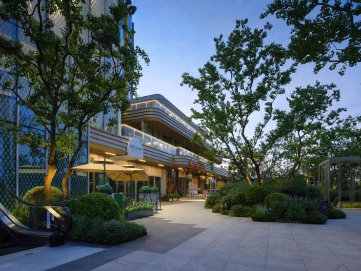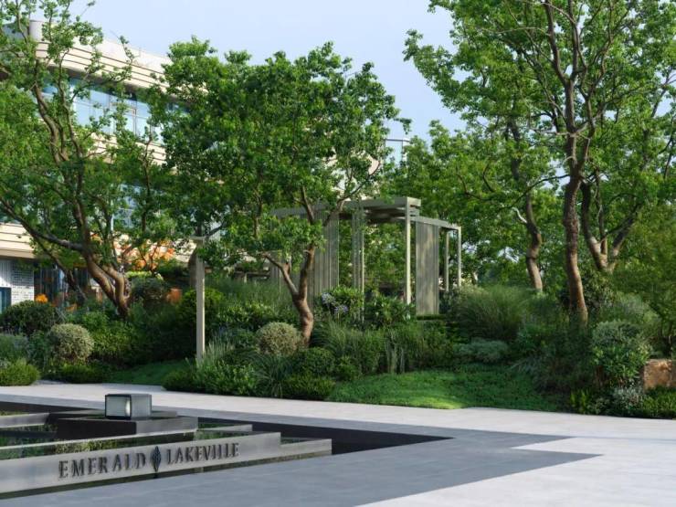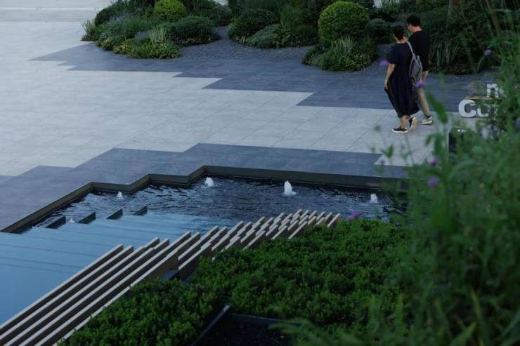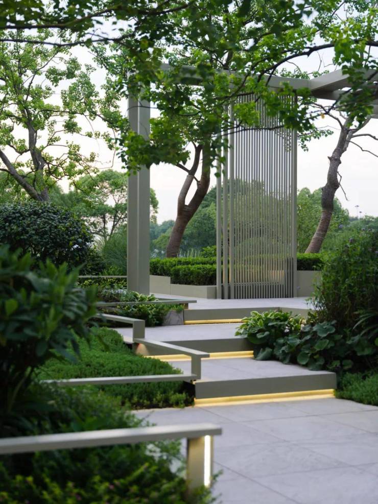 礼仪入口,景观空间以层级错落的溢水平台来作为人视点的第一昭示面,融合开合有序,鳞次栉比的植物组团,虚实之间,层层递进,随着线性引导的铺装形式引路向前,一种大巧若拙,大美若朴的精神转译为空间注脚,邂逅立体森境。