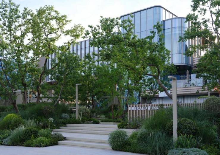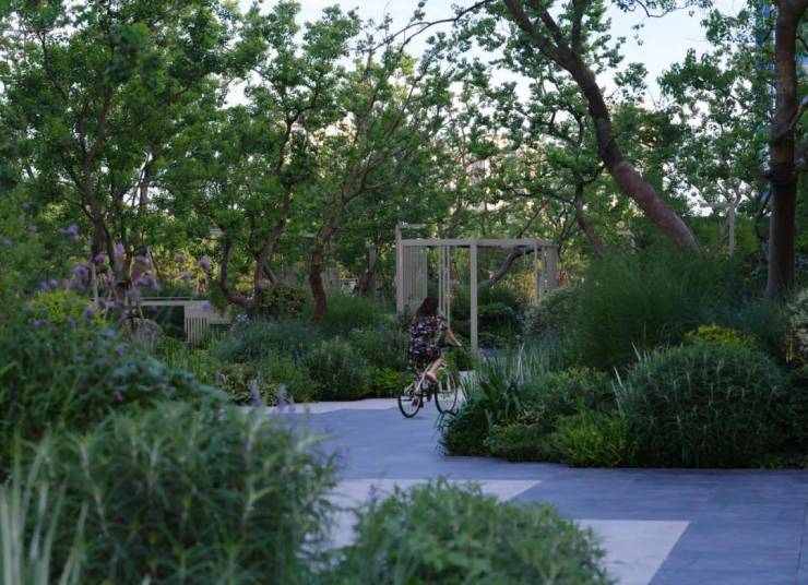 在城市周界的处理上,我们以特色的植物组团为媒介,给繁忙都市以“缓冲退隐”处理。带状花境镌刻场地印记,为通行界面创造停留的同时,关于城市的自然新生也一并带入到项目之中。