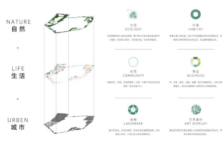 对此我们不断思考探索我们要如何借助丰富的自然资源来实现景观价值?在景观价值的基础上又应如何拓展丰富的商业配套,进一步提升社区价值,板块价值?如何缔结社区与公园之间缺失的一环,平衡人类体验、自然环境和多元化的公共空间?最终我们选择回归场地,在生态资源赋能的基础之上考虑地与图的关系转化,依托宛山湖生态湿地环境和开放式街区建筑形态,将原本“一字型”的规划设计住宅,平面立体切分成北侧与南侧两部分并形成自然的通过空间,随之相应植入多种社区商业配套。同时我们在关注环境的敏感性与持续性的基础之上容纳“社区生活+沉浸体验+生态未来”的设计原则,以期创造而生“公园AND”+“街区”的生态商业未来社区场景化生活综合体,创新未来,打造由内而外独具差异化的生态商业生活。