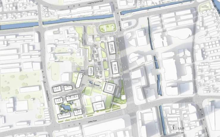 总体规划分层布置南北向空间,并沿着基地东西轴线布置业态。一分为二的车道贯穿基地中部,并充当中央轴线。