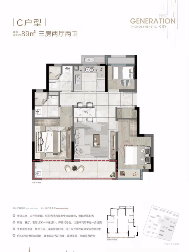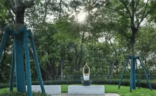 社区内部以“一环三轴四园七景”布局打造景观空间,3条贯穿东西及南北的景观轴,串联社区出入口;一条健康环形跑道、四大全龄成长园林、七大庭间景观花园,为全龄成长、运动、休闲,创造健康活力的“光合社区”。