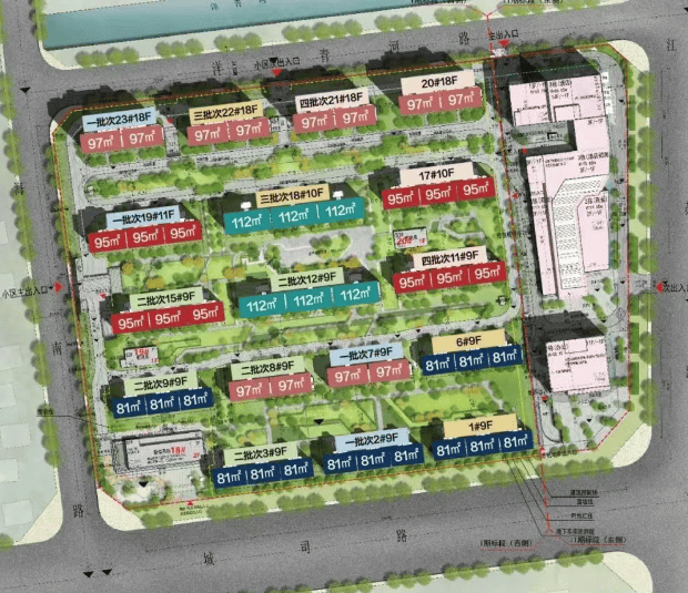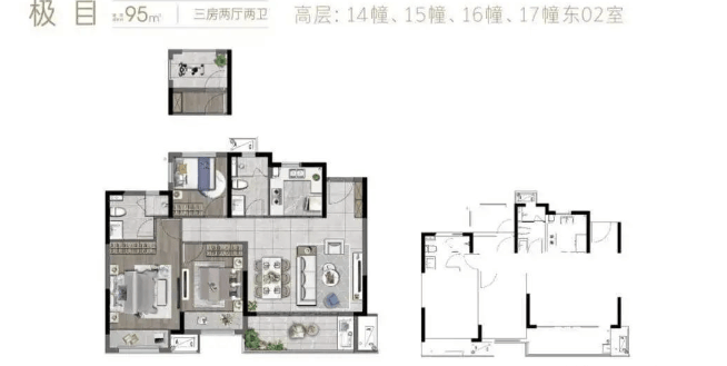 建面 95㎡三房:分布于 19#、17#、15#、11# 等楼栋,1 梯 2 户,层高 2.95 米,总楼层 9-11F。