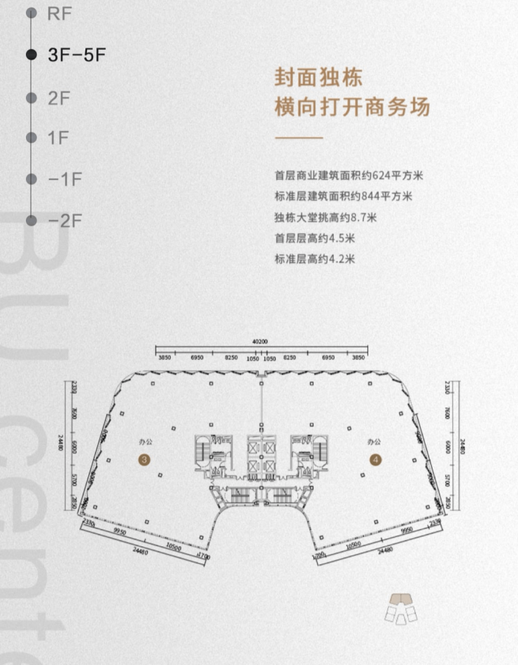 层高:大堂挑高8.7米,地上一层商业性质4.5米,二至五层4.2米
