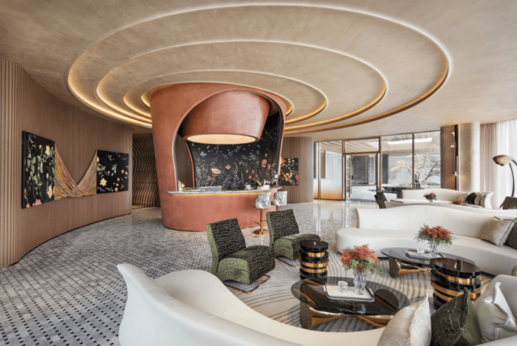 在景观设计上,晴屿望湖注重人文传承与场景创新,通过溯源湖州水漾文化,并对标Alila五星级酒店的高奢度假风,为湖州开创酒店度假式水院景观,形成由约800㎡中央水景辐射的松弛度假场域。