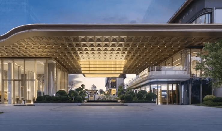 建筑与景观:四面铝板 + 石材基座,弧形转角设计,阳台统一封包;双河道 + 中央园林,架空层设儿童区、会客区、私宴厅;
