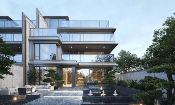 建筑设计:采用新中式与海派风格融合的设计,建筑立面精致。如 132 米海派艺术长廊,拱门序列优美,外挑式门头镶有 134 块不锈钢钻石切面钛合金星芒顶,极具奢华感。