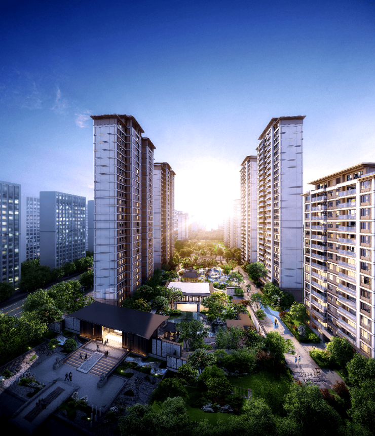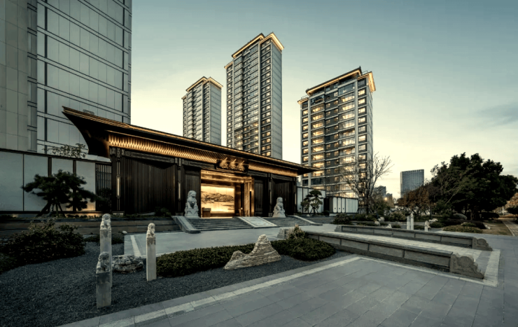建筑设计:采用新中式建筑风格,建有 42 栋联排别墅、13 栋叠墅和 22 栋洋房,中轴对称,礼序井然,同时融入现代建筑元素。