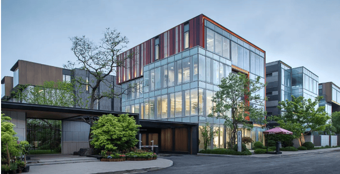 项目由星月投资与北科建联合开发,line+建筑事务所主持建筑师孟凡浩领衔设计,融合江南园林美学与现代建筑语言,打造低密度的独栋式园区。整个园区由71栋3至4层的花园独栋组成,采用“上居下办”的空间模式,实现办公、居住、社交功能的垂直整合。