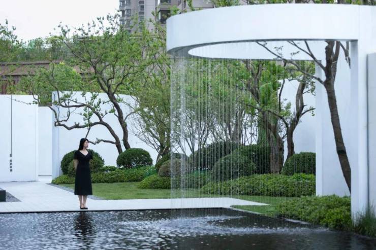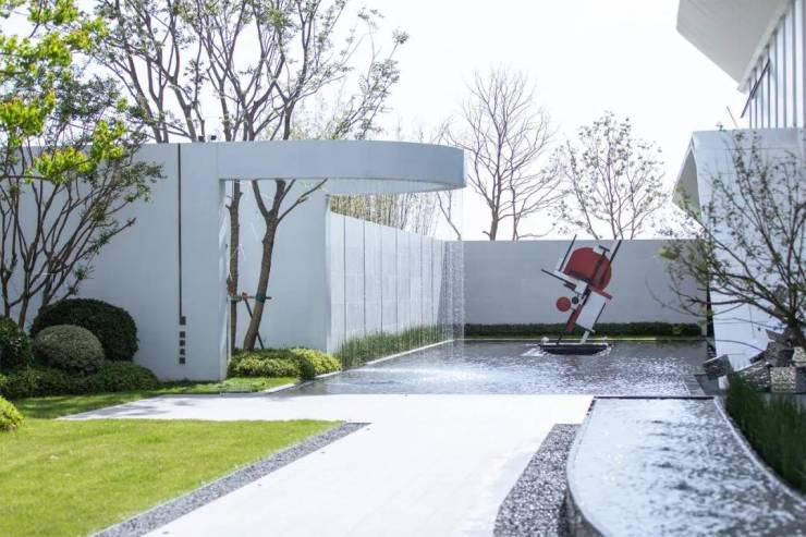 设计中加入了水和雕塑,视觉的聚焦点在半弧形线形跌水和“映湖”的静水雕塑,水的自然之音会让观者心生静谧。