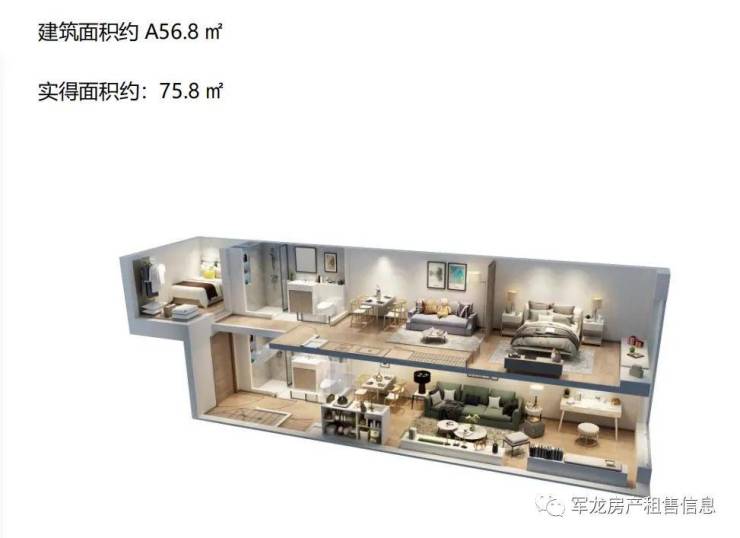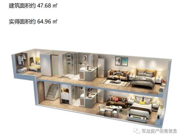 “ 双钥匙 ” 公寓—投资之王! 建筑面积约47.68—56.8㎡,实得使用面积约64.96—75.8㎡ ,6梯30户,一户开门,内里上下两套独立公寓,4.5米层高,可分层居住或出租,也可住一套租一套,灵活百变。为实现真正上下独立,避免分层居住或出租引发的缴费纷争,水电分流,一户两表(民水民电),安心省心。于2021年底精装交房!