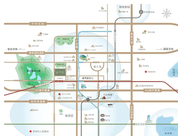 交通配套:拥有双轨双环 + 三纵三横的多维交通模式,临近轨交 4 号线孙武纪念园站以及轨交 8 号线(在建)虎丘湿地公园站,与苏州其他轨交线路均可无缝换乘;邻近中北双环快速路入口,紧邻 G2 京沪高速,可快速链接长三角城市群。