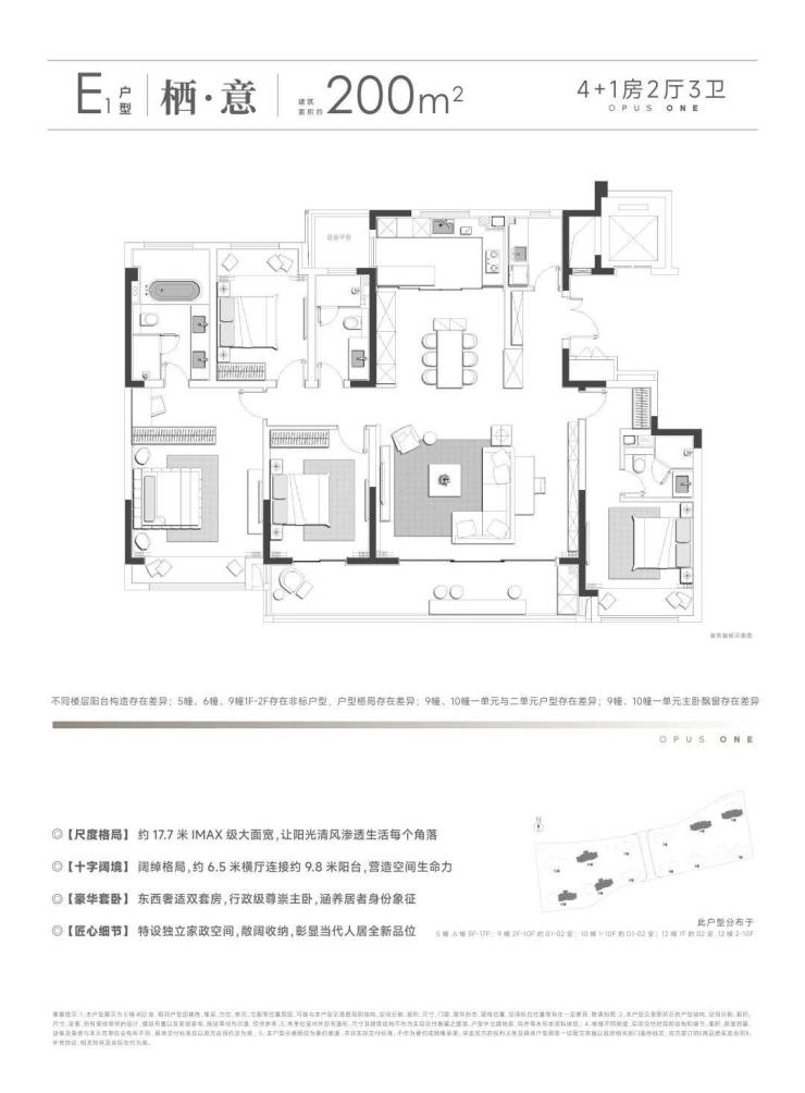 户型起步165㎡,最大248㎡,定位纯粹的低密大平层社区。每个户型都是双联阳台,最大的尺度做到了11.2米。