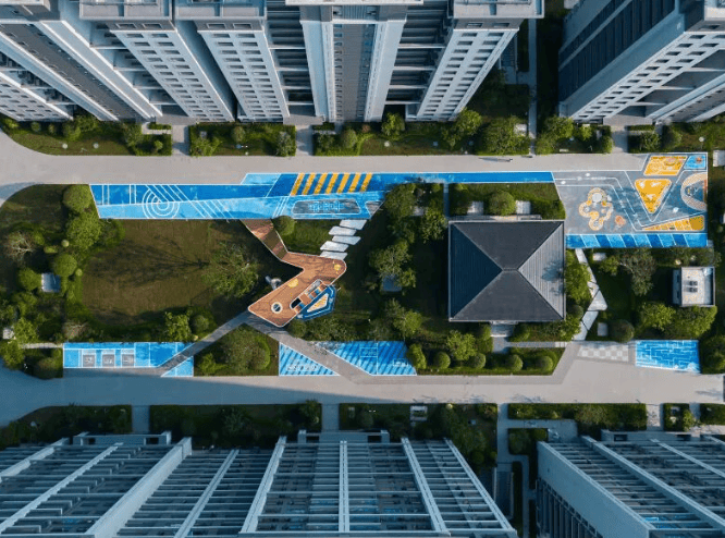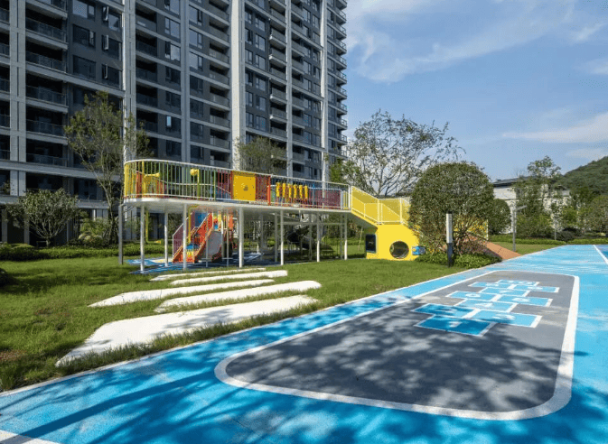 在高层和合院之间打造了一条约 300 米的娜塔栎树阵,二期最北面有樱花大道。小区内部还规划有全龄段儿童天地、景观会客厅、主题架空层、阳光草坪及游廊、回环式健康跑道、滨水游步道等设施,满足业主休闲需求。