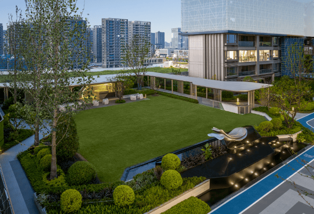 景观布局:以 “空中花园” 作为整体概念,以 “一轴两廊三节点” 作为设计理念,打造 4 大功能空间 + 2 个风雨连廊 + 多个活动场地,覆盖全龄段的需求。