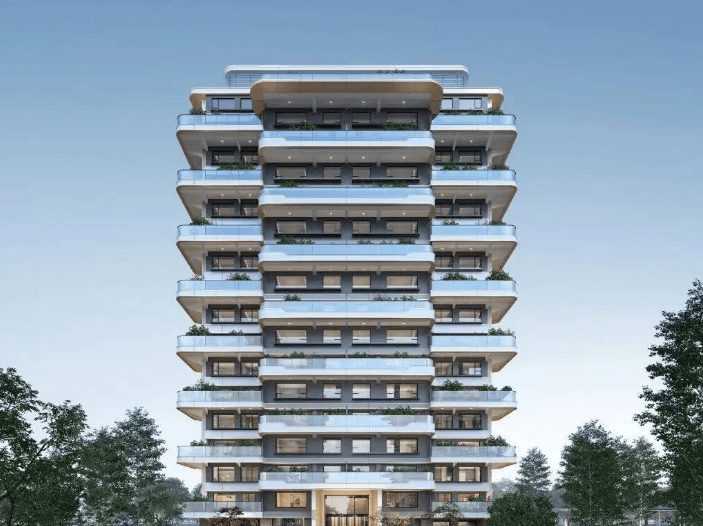 核心指标:占地约 4.3 万㎡,建面约 7.21 万㎡,容积率仅1.6,绿化率约 31.5%;总户数 442 户,车位配比约 1:1.9–1:2,车位充足;外立面现代简约,大面积玻璃 + 金属线条,质感通透;