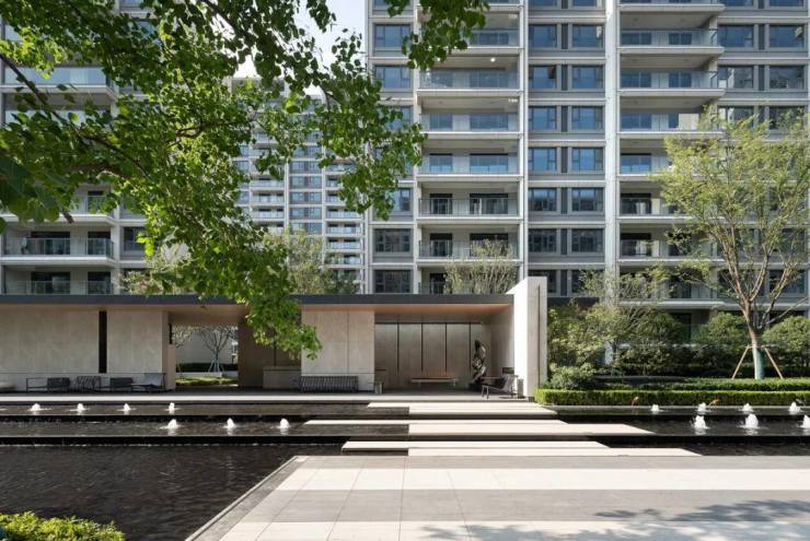 精心打造的景观中轴终于展露真容,中央水景与廊下空间结合得相得益彰,更是灵动有趣。业主可以在廊下空间,或聊天,或社交,或赏景。